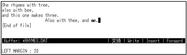 キーボードから文字をタイプ入力できます。 日本語EVEは,バッファの現在のモード(挿入モード/重ね書きモード)にしたがって, バッファの現在のカーソルの位置に文字を追加します。