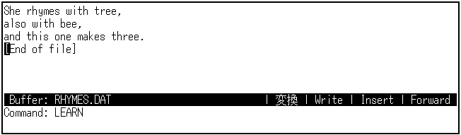 短縮形を区別できる十分な文字をタイプし,[Return]キーを押すと, そのコマンドが実行されます。また,バッファ名,ファイル名, および MARK コマンドのラベル名も,同様に省略することができます。 これらの場合も,短縮形があいまいなときには, 日本語EVEは対応するもののリストを表示します。