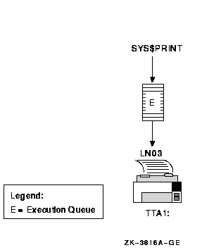 DCLのSUBMITまたはPRINTコマンドを入力する,またはアプリケーションを介してキューに登録されたバッチ・ ジョブまたはプリント・ジョブは,キューに送られて処理を待ちます。 ジョブのタイプ,ファイル名,キュー名, 特殊オプションを含めた,ユーザのキュー要求についての情報は,キュー・ マネージャに送られます。キュー・マネージャは該当する情報をキュー・ データベースに記録し,実際にジョブをプリントまたは実行するときにデータベースから読み出します。