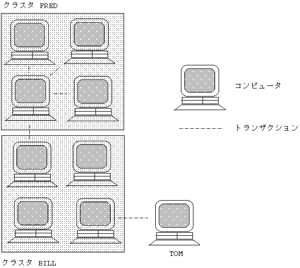 この図で,9台のコンピュータはすべて同じトランザクション・グループに属します。 これは次の理由によります。