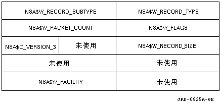 | レコード・ サイズ | NSA$W_RECORD_SIZE | 監査メッセージ全体のサイズ。 サイズはヘッダ・パケットとすべてのデータ・ パケットの合計である。(ワード) |