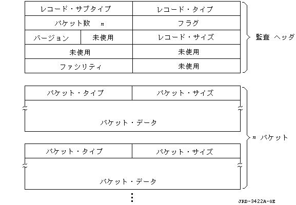 セキュリティ監査レコードには,ヘッダ・パケットが1つ格納され,その後に, 図 F-1に示す1つ以上のデータ・ パケットが続きます。データ・パケットの数は,送信する情報の種類によって異なります。 この付録では,監査ヘッダとデータ・パケットの形式について説明し, データ・パケットの内容についても説明します。