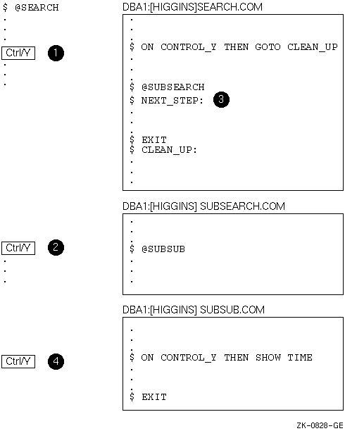 次の図は,ネストされたコマンド・プロシージャの実行中に Ctrl/Yを押すとどうなるかを示しています。