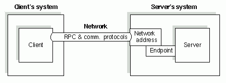 Binding information includes a set of information that identifies a server to a client or a client to a server. Each instance of binding information contains all or part of a single address. The RPC runtime maintains binding information for RPC servers and clients. To make a specific instance of locally maintained binding information available to a given server or client, the runtime creates a local reference known as a binding handle. Servers and clients use binding handles to refer to binding information in runtime calls or remote procedure calls. A server obtains a complete list of its binding handles from its RPC runtime. A client obtains one binding handle at a time from its RPC runtime. The following figure illustrates a binding.