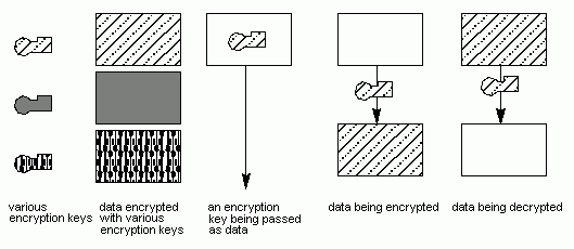 In these figures, fill patterns represent encryption key values and encrypted data. The key symbol within a box indicates that a key is being passed as data. The key symbol on a line indicates that encryption or decryption is taking place, depending on whether the resulting data is represented as encrypted or not. These conventions are shown in the following figure.