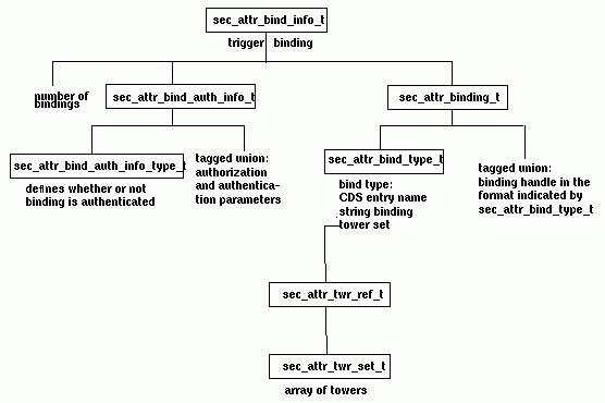 The sec_attr_bind_info_t data type uses two data types: sec_attr_binding_t, which defines the information used to generate binding handle and sec_attr_bind_auth_info_t, which defines the binding authentication and authorization information.