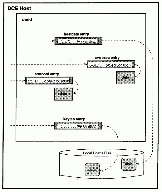 The data for each hostdata item is stored in a file on disk. The dced program uses the UUID to find the entry in the hostdata entry list. The entry's storage tag is then used to find the data. For hostdata, the tag contains a filename in OSF's reference implementation. The data returned for one entry is an array of strings in a sec_attr_t structure.