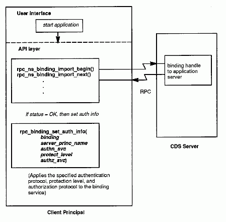 1. Having been authenticated and having acquired a PTGT, the user now invokes (the client side of) an application. The client side of the application calls rpc_binding_import_begin( ), rpc_binding_import_next( ), and the like. These calls specify the remote interfaces required by the client for the application.