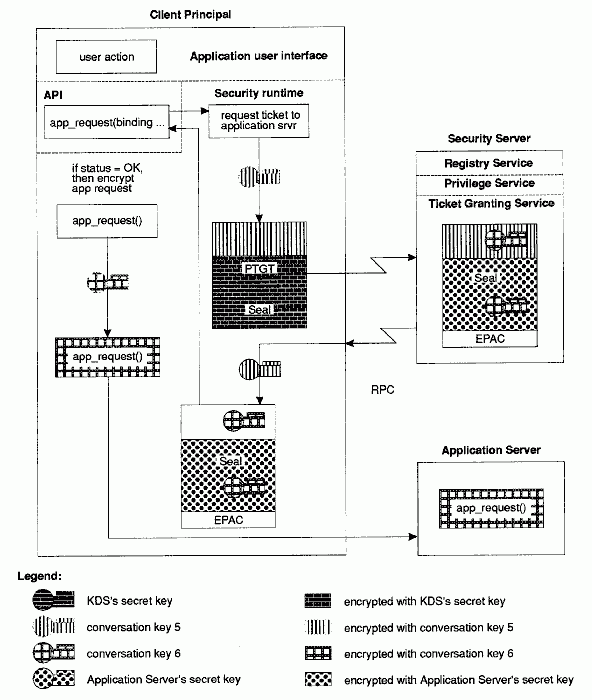 6. The client's security runtime uses conversation key 5 to decrypt conversation key 6, and then uses conversation key 6 to encrypt the application-level RPC request to the server. The client's RPC runtime sends the encrypted application request to the application server, together with the service ticket.