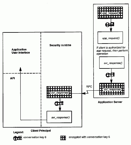 7. The application server's security runtime receives the client's request and decrypts the service ticket by using its secret key, or the TGT session key if user-to-user based authentication is used. In this way, the server's security runtime learns conversation key 6 and uses it to decrypt the RPC request. If the server determines from the client's authorization information (EPAC chain) that the request is granted, it performs the requested operation and prepares a response. The server's runtime encrypts the response by using the conversation key 6 and sends it back to the client.
