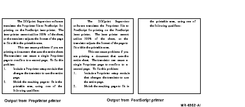 Applications that create files for Proprinter print jobs assume that the entire page is available for printing. Dot matrix printers, such as Proprinter devices, use the full page. Laser printers, such as those supported by the DECprint Supervisor for OpenVMS software, have a printable area that is often smaller than the entire page, and leave a blank margin around the printable area.