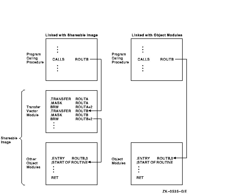 Use .TRANSFER with procedures entered by the CALLS or CALLG instruction. In this case, use .TRANSFER with the .ENTRY and .MASK directives. The branch to the actual routine must be a branch to the entry point plus 2 to bypass the 2-byte register save mask.