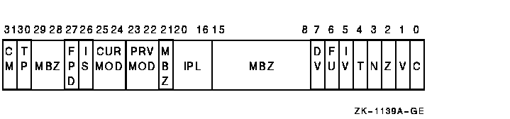 The processor status longword (PSL) consists of a set of processor state variables associated with each process. Bits 31:16 of the PSL have privileged status. For information on this part of the PSL, refer to the VAX Architecture Reference Manual. Bits 15:0 of the PSL are referred to separately as the processor status word (PSW).