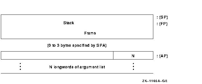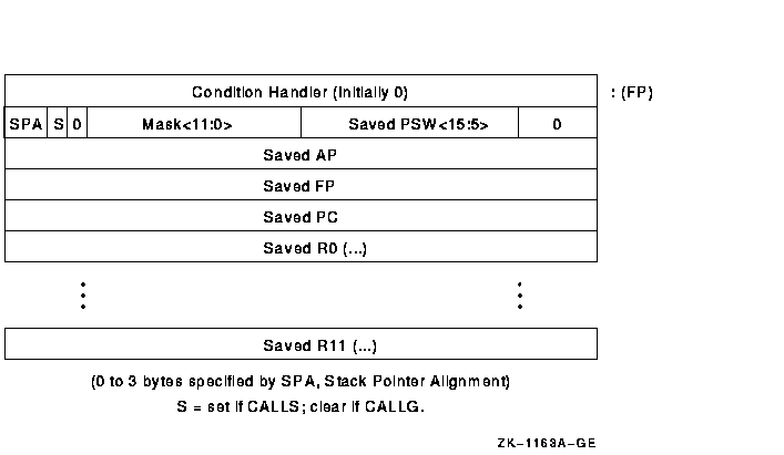 At the occurrence of one of the call instructions, the stack is aligned to a longword boundary, and the trap enables in the processor status longword (PSW) are set to a known state to ensure consistent behavior of the called procedure. Integer overflow enable and decimal overflow enable are affected according to bits 14 and 15 of the entry mask, respectively. Floating underflow enable is cleared. Registers R11 to R0, specified by bits 11 to 0, respectively, are saved on the stack and are restored by the RET instruction. In addition, the program counter (PC), stack pointer (SP), frame pointer (FP), and argument pointer (AP) are always preserved by the CALL instructions and restored by the RET instruction.