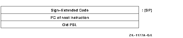 Change mode instructions allow processes to change their access mode in a controlled manner. The instruction increases privilege only (decreases the access mode).A change in mode also results in a change of stack pointers; the old pointer is saved, and the new pointer is loaded. The processor status longword (PSL), program counter (PC), and code passed by the instruction are pushed onto the stack of the new mode. The saved PC addresses the instruction following the CHMx instruction. The code is sign extended. After execution, the appearance of the new stack is as follows: