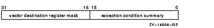 The VAER, shown in Figure 10-6, is a read-only register used to record information regarding vector arithmetic exceptions. Table 10-4 shows the encoding for the exception condition types. The destination register mask field of VAER records which vector registers have received default results due to arithmetic exceptions. VAER<16+n> corresponds to vector register Vn, where n is between 0 and 15. For more information, refer to Section 10.6.2, Vector Arithmetic Exceptions.