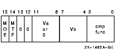 The scalar or Va operand is compared, elementwise, with vector register Vb. The length of the vector is specified by the Vector Length Register (VLR). For each element comparison, if the specified relationship is true, the Vector Mask Register bit (VMR<i>) corresponding to the vector element is set to one; otherwise, it is cleared. If cntrl<MOE> is set, VMR bits corresponding to elements that do not match cntrl<MTF> are left unchanged. VMR bits beyond the vector length are left unchanged. Only bits <31:0> of each vector element participate in the operation.
