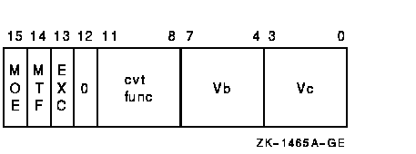 The vector elements in vector register Vb are converted and results are written to vector register Vc. Cntrl<11:8> specifies the conversion to be performed. The length of the vector is specified by the Vector Length Register (VLR). Bits <63:32> of Vc are UNPREDICTABLE for instructions that convert from D_floating or G_floating to F_floating or longword. When CVTRGL, CVTRDL, and CVTRFL round, the rounding is done in sign magnitude, before conversion to two's complement.If an integer overflow occurs when cntrl<EXC> is set, the low-order 32 bits of the true result are written to the destination element as the result, and the exception condition type and destination register number are recorded in the Vector Arithmetic Exception Register (VAER). The vector operation is then allowed to complete. If integer overflow occurs when cntrl<EXC> is clear, the low-order 32 bits of the true result are written to the destination element, and no other action is taken.