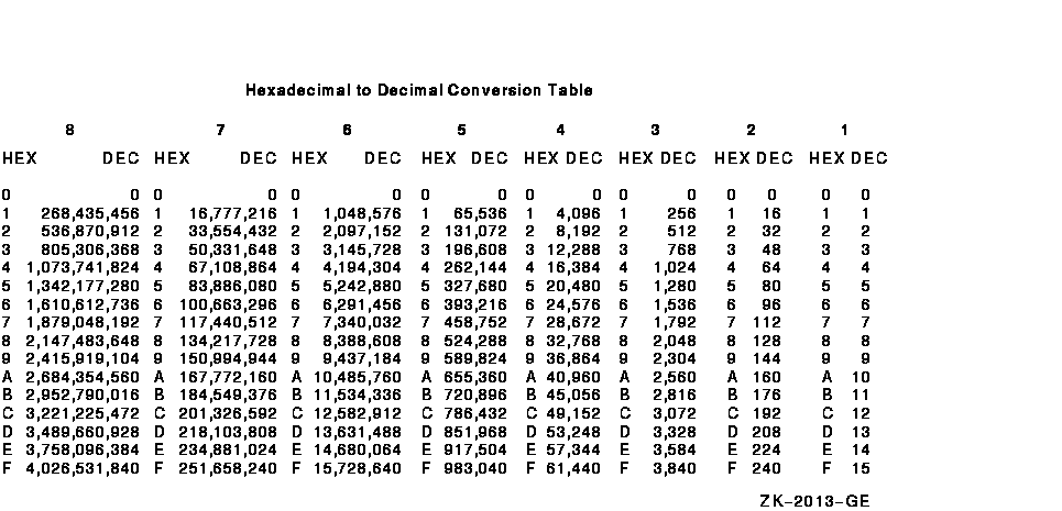 The following table lists the decimal value for each possible hexadecimal value in each byte of a longword. The following sections contain instructions to use the table to convert hexadecimal numbers to decimal and decimal numbers to hexadecimal.