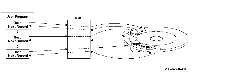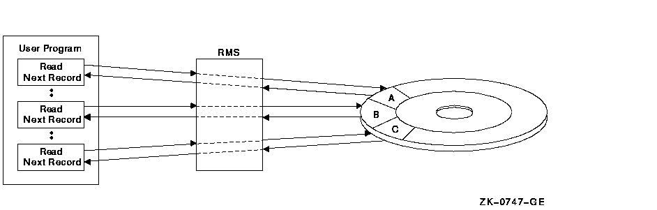 Figure 2-1 shows a disk surface. Each lettered section on the surface represents a record in a sequential file, beginning with record A. When the program requests sequential access to the file records, RMS interprets each request in the context of the file's organization.
