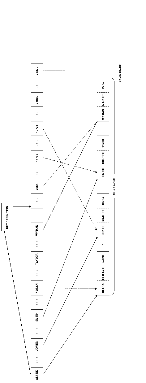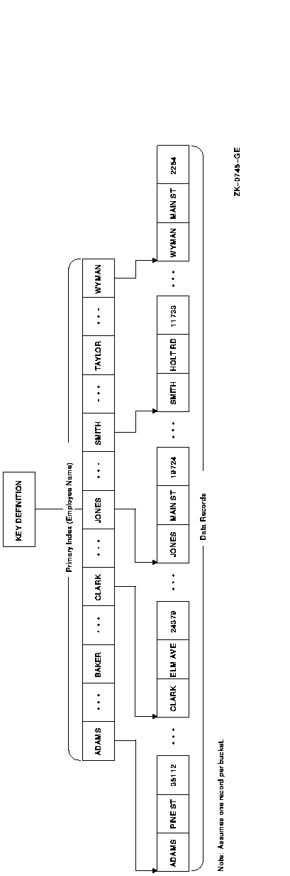 Figure 2-12 illustrates the general structure of an indexed file containing only a primary key: the employee name in an employment record file. Figure 2-13 illustrates the general structure of an indexed file in which the primary key and one alternate key are defined. The primary key is the name of the employee; the alternate key is the employee badge number in an employment record file.