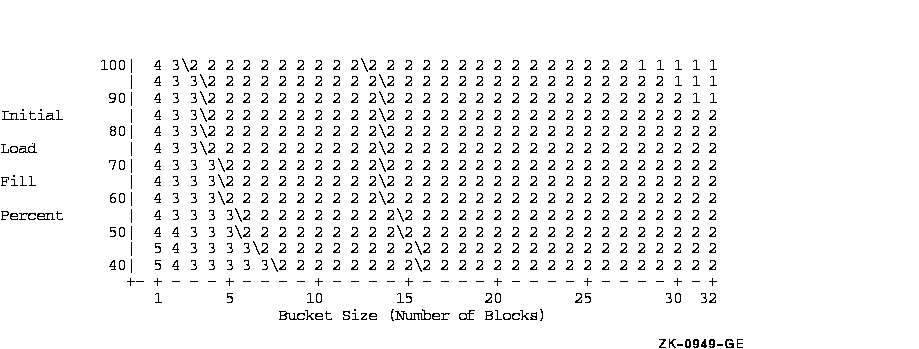 The area on the graph within the slash marks represents combinations that RMS finds acceptable. In Figure 4-2, a fill factor of 70% and a bucket size of 10 blocks is the optimum combination. A fill factor of 70% and a bucket size of 15 blocks is a relatively poor combination because it falls outside of the slash boundaries.