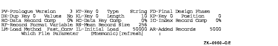 Figure 4-3 shows the attributes that you can alter when the Edit/FDL utility displays the graph. Note that each attribute has a 2-letter mnemonic. To alter an attribute, you specify the corresponding mnemonic. To refresh the display, press the Return key. To begin the final design phase, enter "FD."
