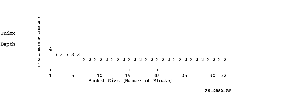 As shown in Figure 4-1, a bucket size of 1 block results in an index with five levels. Increasing the bucket size to 2 blocks reduces the number of index levels to four, but an increase to 5 blocks does not reduce the number of index levels at all. A bucket size of 7 blocks, however, reduces the number of index levels to three.